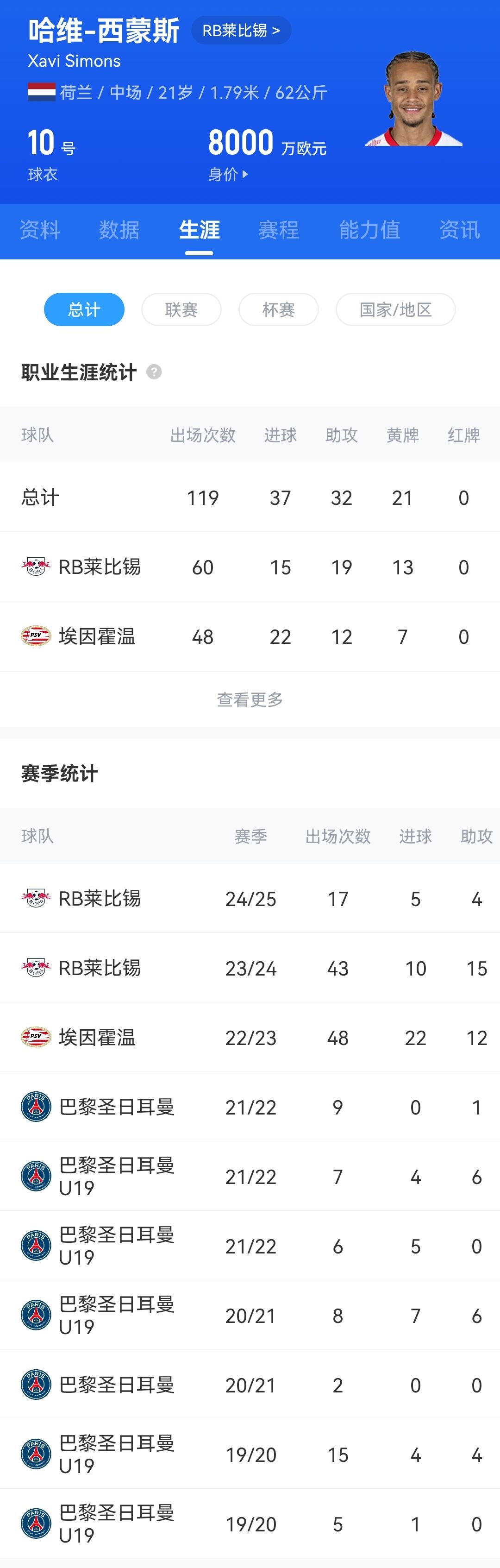 哈维-西蒙斯近两个赛季被巴黎外租至莱比锡,本赛季西蒙斯代表莱比锡出战17场,贡献5球4助攻。