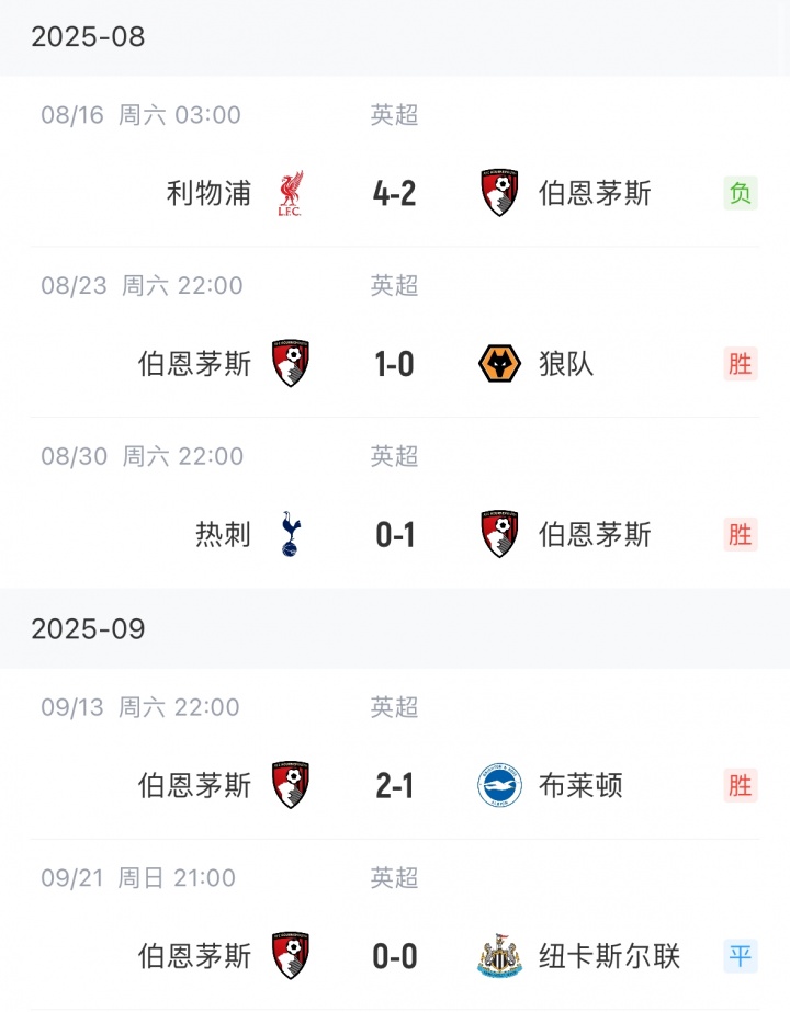09月21日讯 英超第5轮,伯恩茅斯0-0战平纽卡,新赛季五轮3胜1平1负积10分暂列英超第3。