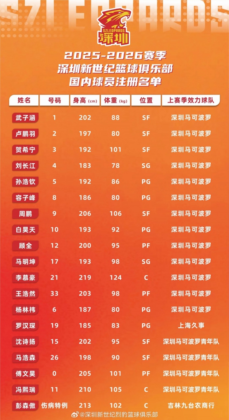 2025-2026赛季深圳新世纪篮球俱乐部国内球员注册名单已正式揭晓。顾全、孙浩钦、武子涵、刘长江成功完成续约;罗汉琛、彭森傲则重返烈豹大...